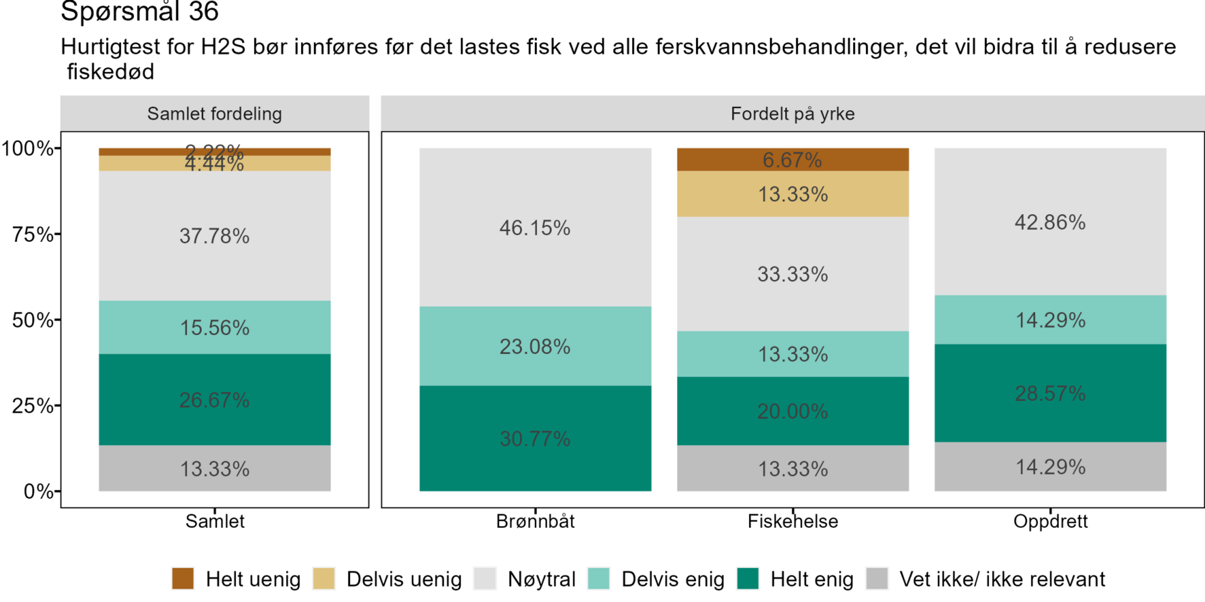 Det kan være problematisk å benytte siste rest av vann i presenning/depot eller hvis ferskvannet har stått lenge, da dette kan medføre utfordringer med H2S og risiko for høy dødelighet. Det ble i spørreundersøkelsen undersøkt om det bør innføres hurtigtest for H2S i forkant av lasting ved alle ferskvannsbehandlinger, og resultatene fra undersøkelsen indikerer at det er en del usikkerhet rundt det, men at det er få som er uenige i det (6,6%; Spørsmål 36). Av brønnbåtpersonellet var 53,9 % helt enig eller delvis enig i at det vil bidra til å redusere fiskedød ved å innføre hurtigtest i forkant av lasting ved ferskvannsbehandling. Det anbefales derfor å hurtigteste ferskvannskilden for H2S i forkant av behandling. En av intervjupersonene trakk frem dødelighetshendelser ved 20-40 µg/l. De hadde også hatt dødelighet ved 10 µg/l, men var usikker på om det kan knyttes til H2S.