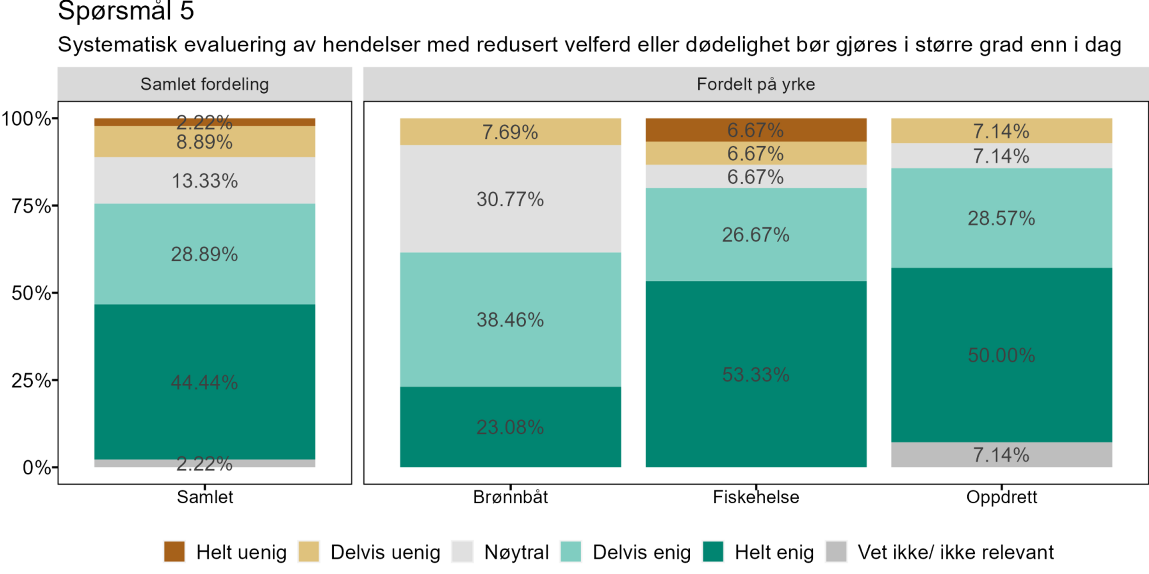 Basert på spørreundersøkelsen er 73 % helt enig eller delvis enig i at systematisk evaluering av hendelser med redusert velferd eller dødelighet bør gjøres i større grad enn i dag.