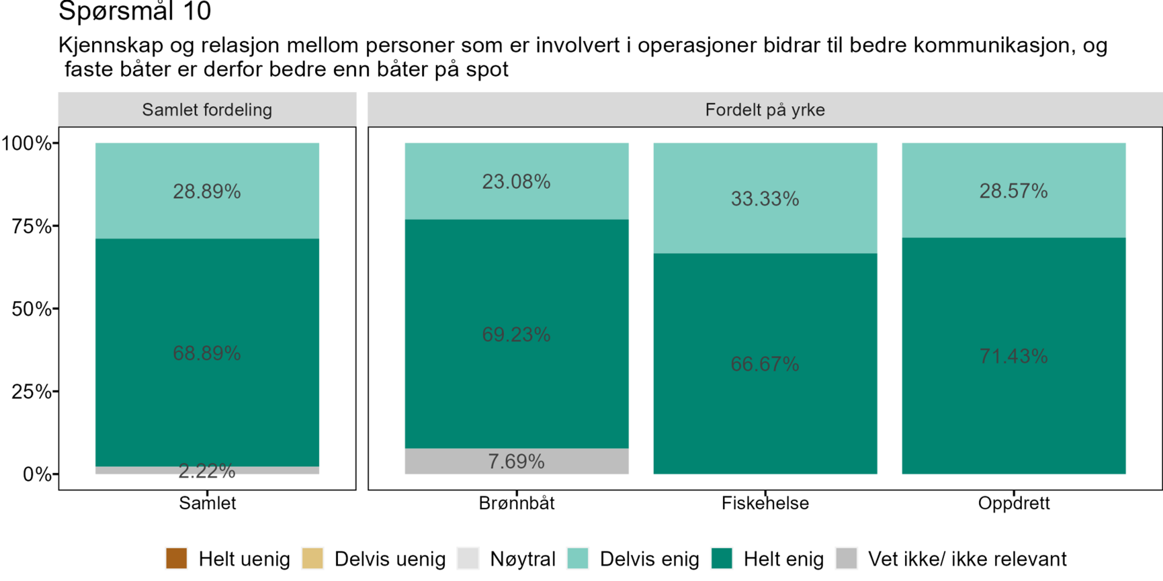 Det bekreftes av spørreundersøkelsen at kjennskap og relasjon mellom personer som er involvert i brønnbåtoperasjoner bidrar til bedre kommunikasjon, og at faste båter derfor er bedre enn båter på spot (Spørsmål 10). På grunn av biosikkerhet og komplekse operasjoner er det en fordel å ha ulike båter som er spesialisert på enkelte operasjoner, og da spesielt egen båt for smolt-transport. Personlige relasjoner mellom personell på brønnbåten, anlegget, fiskehelsepersonellet og ledelsen ble av intervjupersonene ansett som en stor fordel, da det gjør at operasjonen flyter bedre. Det kan derimot være mer krevende økonomisk og må derfor vurderes opp mot fordelene det medfører å ha faste båter. Enkelte av intervjupersonene påpekte at det ved leie av båt på spot kan være større fokus på å gjennomføre operasjonen raskt, enten på grunn av kostnadene til oppdretter eller fordi brønnbåt har et nytt oppdrag som venter.