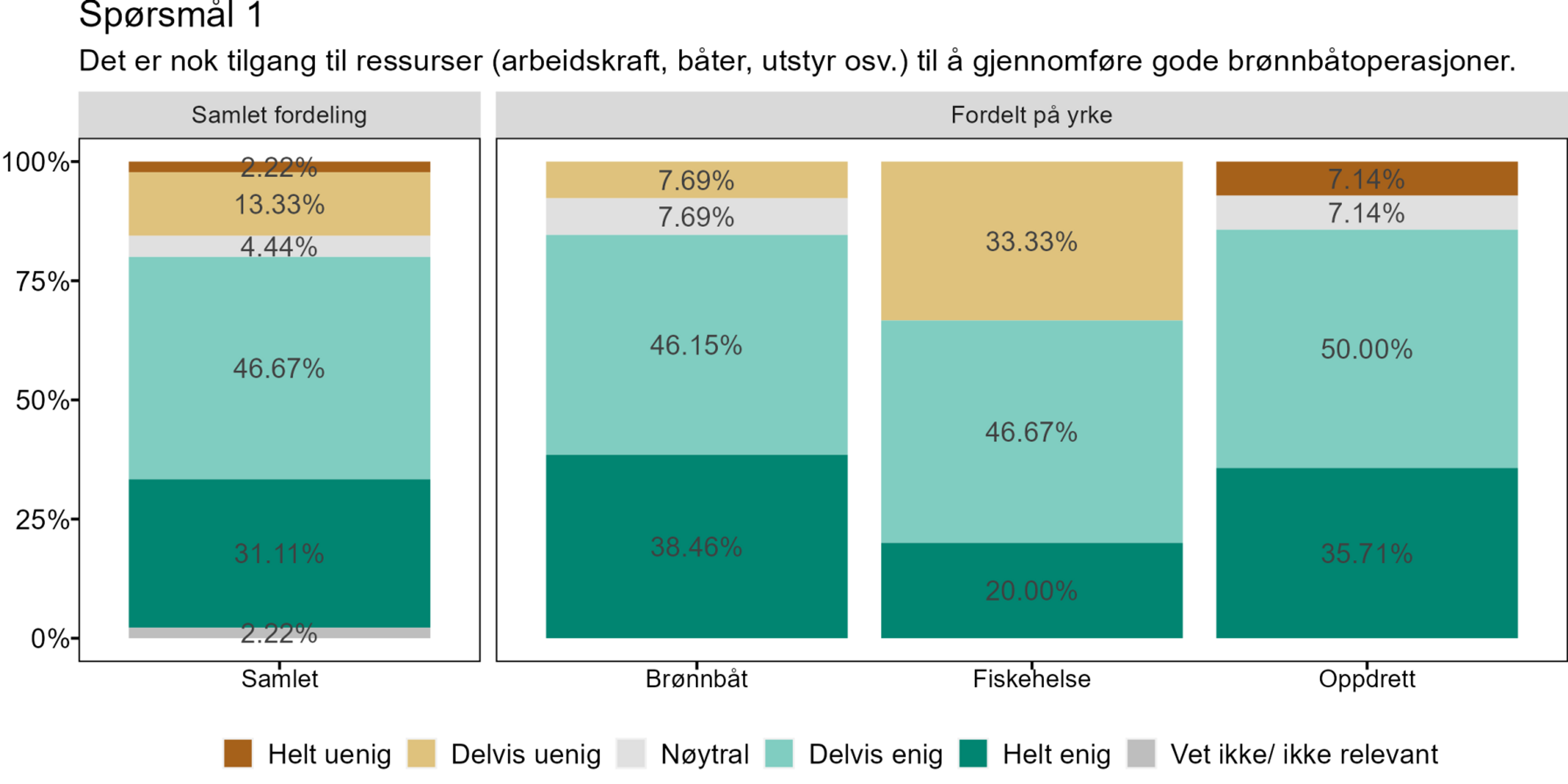 Det ble i spørreundersøkelsen også undersøkt om tilgangen til ressurser er tilstrekkelig for å gjennomføre gode brønnbåtoperasjoner, noe 78 % var delvis enige eller helt enige i at det er. Gruppen som var mest uenig i dette var fiskehelse, hvor 33 % var delvis uenig i at det er nok tilgang til ressurser.