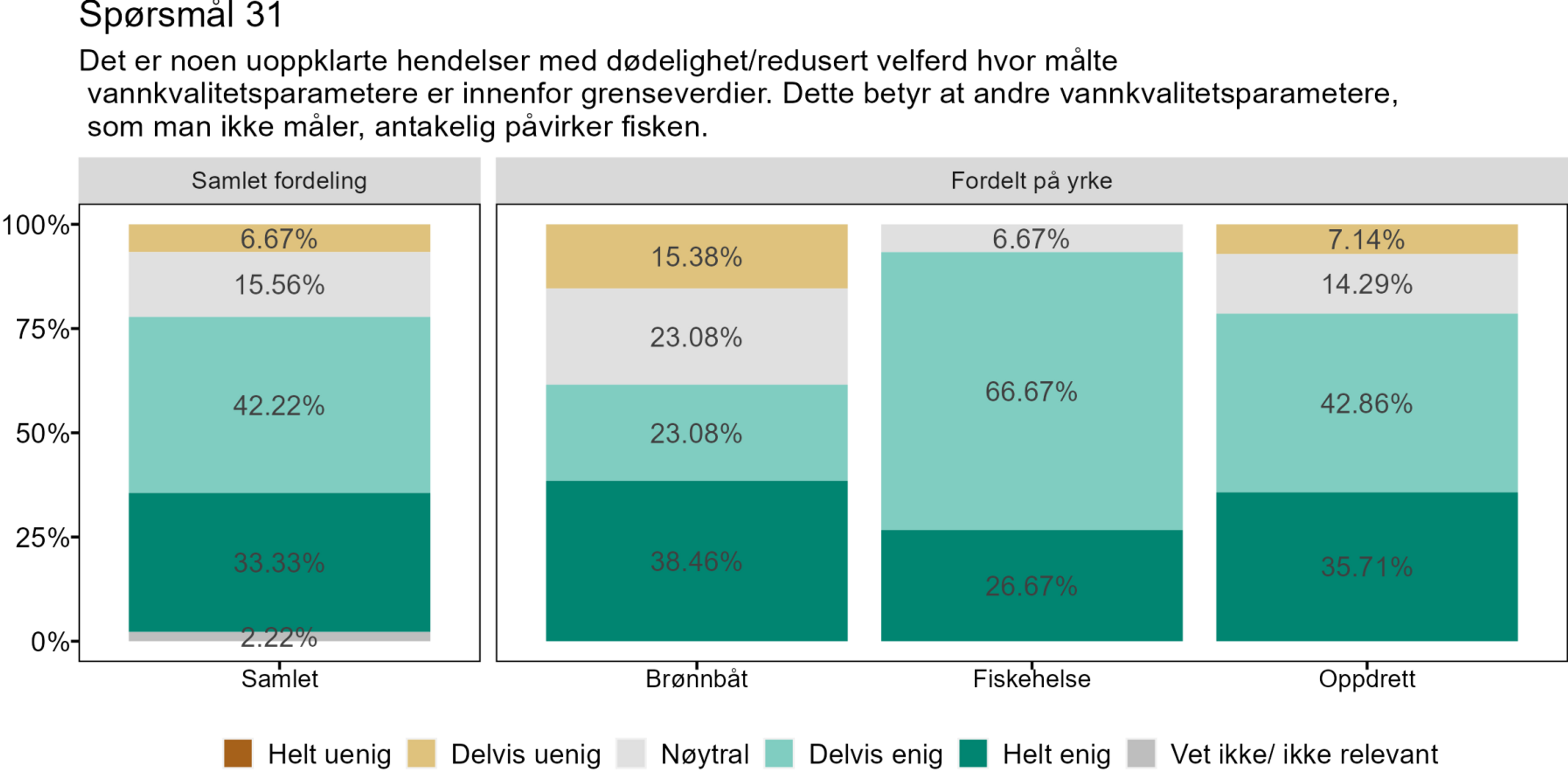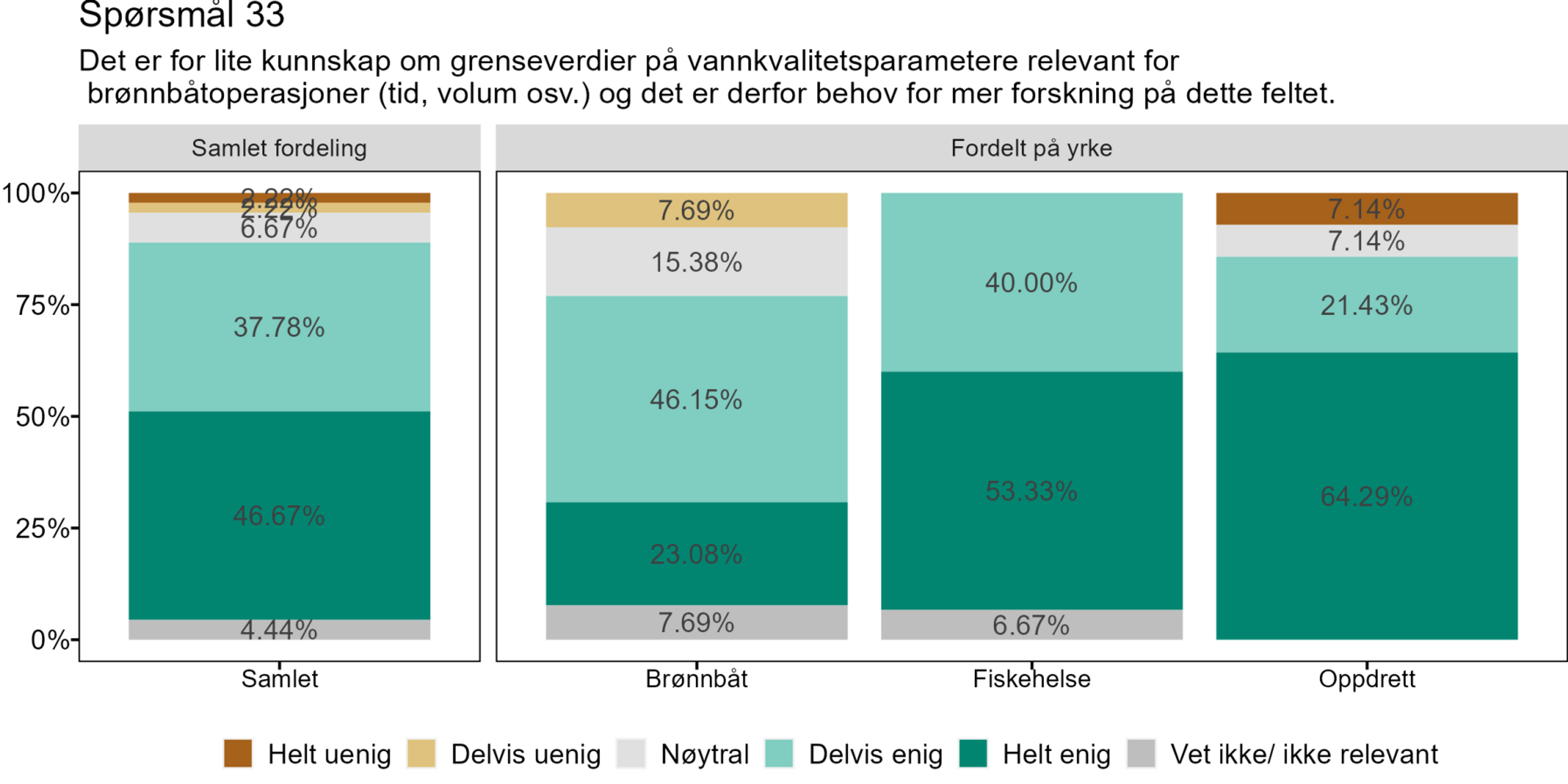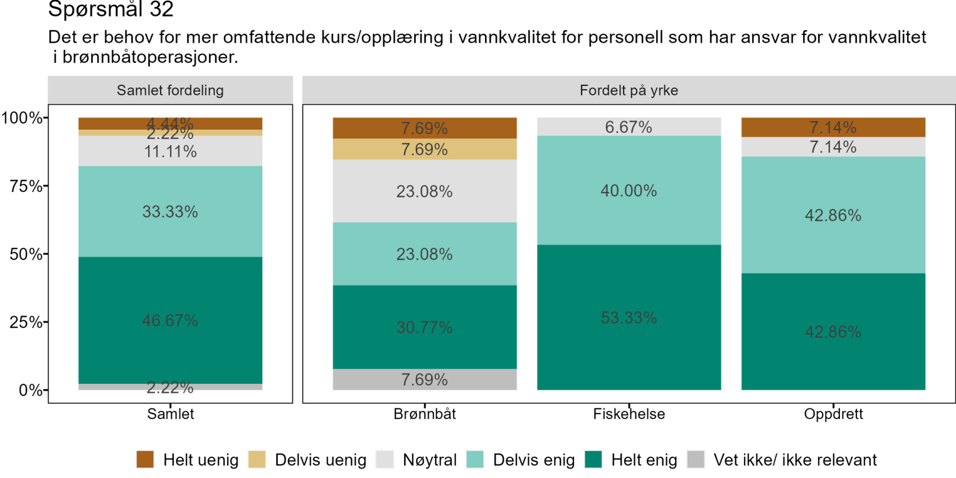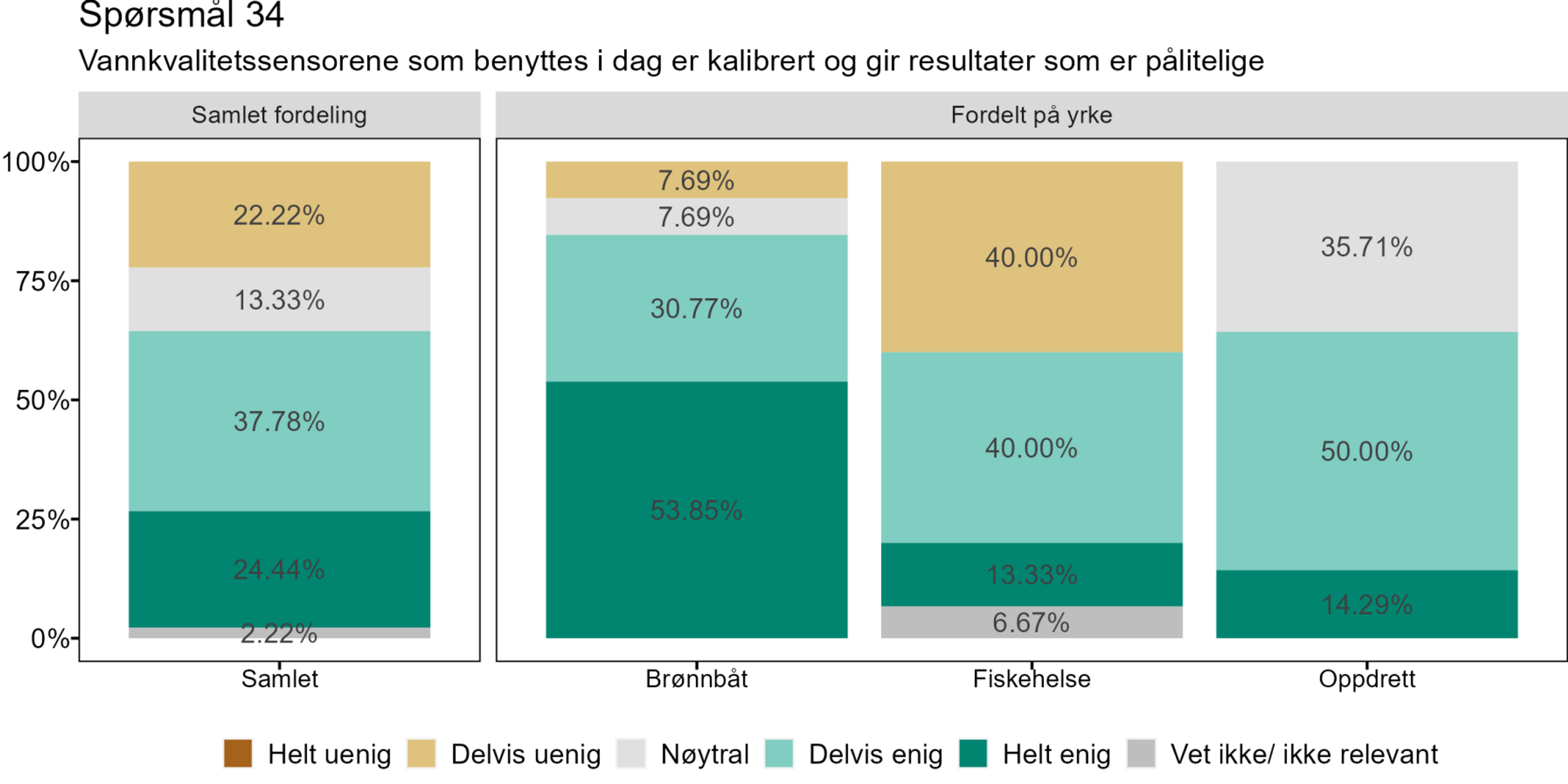 Usikkerheten knyttet til om det er ukjente parametere som ikke logges som kan ha betydning for utfallet er også tydelig fra spørreundersøkelsen (spørsmål 31). Resultatene fra spørreundersøkelsen er også tydelige på at det er behov for mer opplæring og forskning relatert til vannkvalitet om bord i brønnbåt, hvor 80 % av respondentene er enige i at det er behov for mer opplæring (spørsmål 32) og 84 % er enige i behovet for mer forskning (spørsmål 33). Om vannkvalitetssensorene som benyttes i dag er kalibrerte og gir pålitelige resultat er flesteparten enige eller nøytrale, men 40 % av fiskehelsepersonellet er delvis uenige i dette (spørsmål 34).