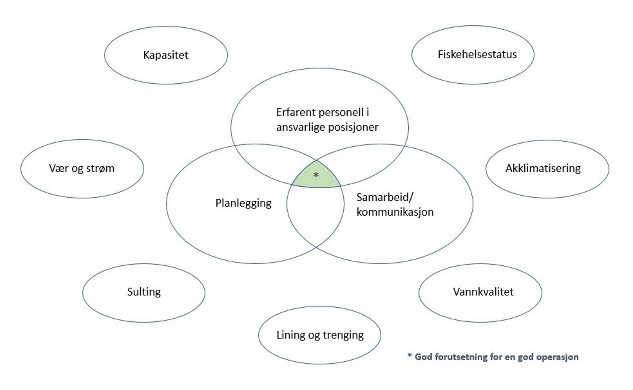 Svarene på disse spørsmålene ga utgangspunkt i en liste med ulike elementer som er viktige for at en brønnbåtoperasjon skal gå bra. Denne listen ble så presentert under gruppeintervjuene for å undersøke med deltakerne om disse punktene dekket risikofaktorene som påvirker laksens helse og velferd mest under brønnbåtoperasjoner. Vi ba de deretter om å rangere de etter kost-nytte, hva som var viktigst (i den grad man klarte det) og hva som ga det beste grunnlaget for brønnbåtoperasjonen. Tilbakemeldingen fra alle de fire gruppene var at listen var komplett, og at erfarent personell i ansvarlige posisjoner, god planlegging og samarbeid/kommunikasjon var de viktigste punktene å legge til grunn. Hadde man kontroll på disse ville man ha et godt grunnlag for en god operasjon, og dermed også ha planlagt hvordan man skal håndtere de andre elementene i listen (fiskestatus, akklimatisering, vannkvalitet, lining og trenging, sulting, vær og strøm og kapasitet).