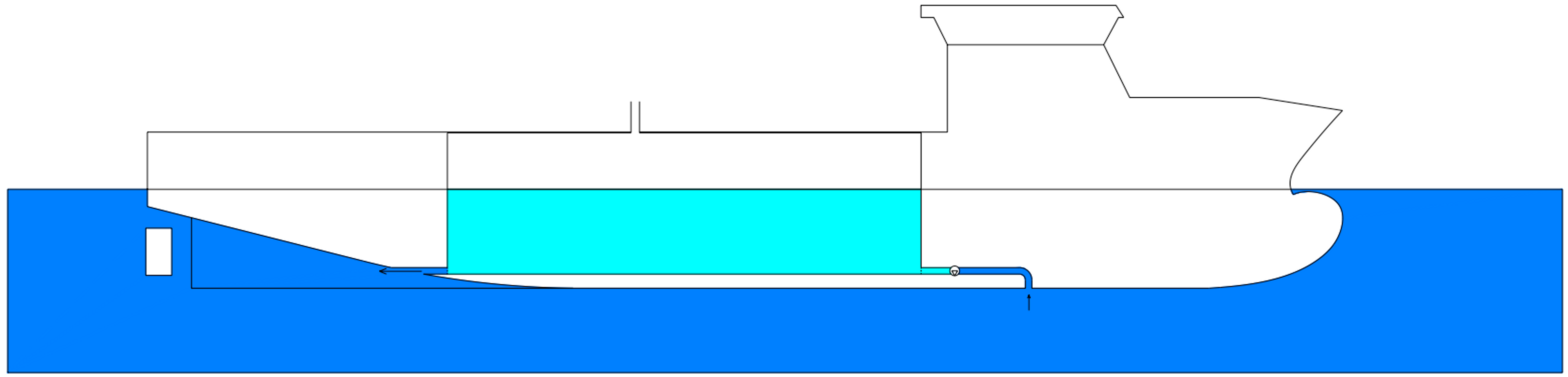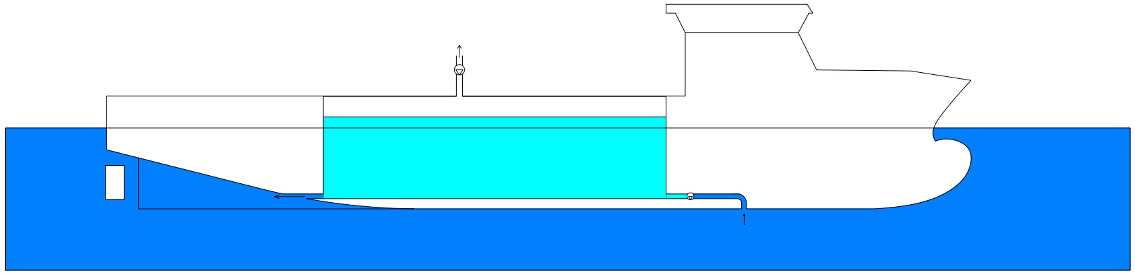 Figur 8: Prinsippskisse åpen transport med undertrykk, hvor vannlinjen i brønnen er høyere enn vannlinjen på sjøen utenfor. Det er ulike prinsipper for sirkulasjon av vann i brønnene, dette er beskrevet under vannsirkulasjon lengre ned. Mørk blå farge er sjøvann utenfor båten. Turkis farge indikerer vann i brønnen.